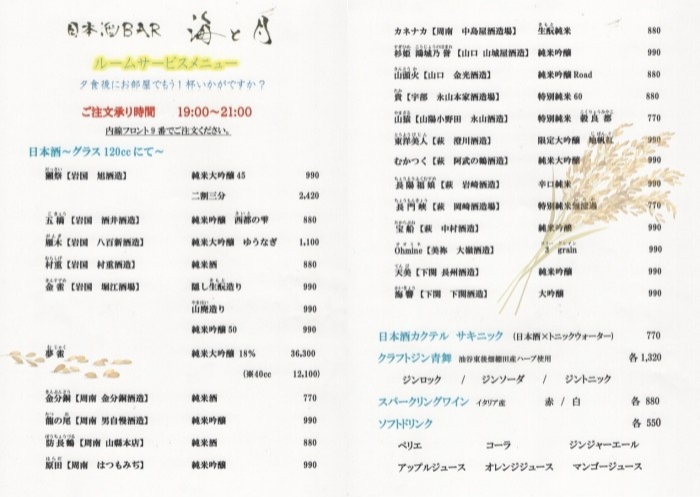 - 【日本酒BAR「海と月」】ルームサービスを始めます~11月11日から。お部屋で日本酒をお楽しみくださいませ♪